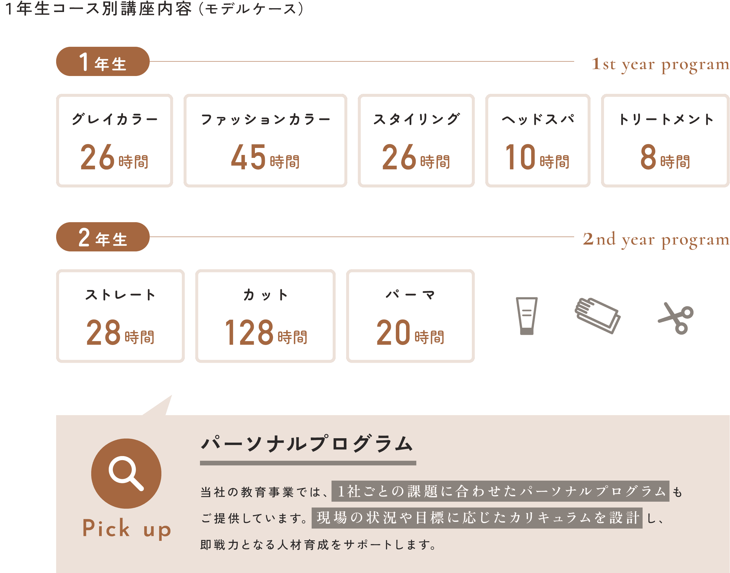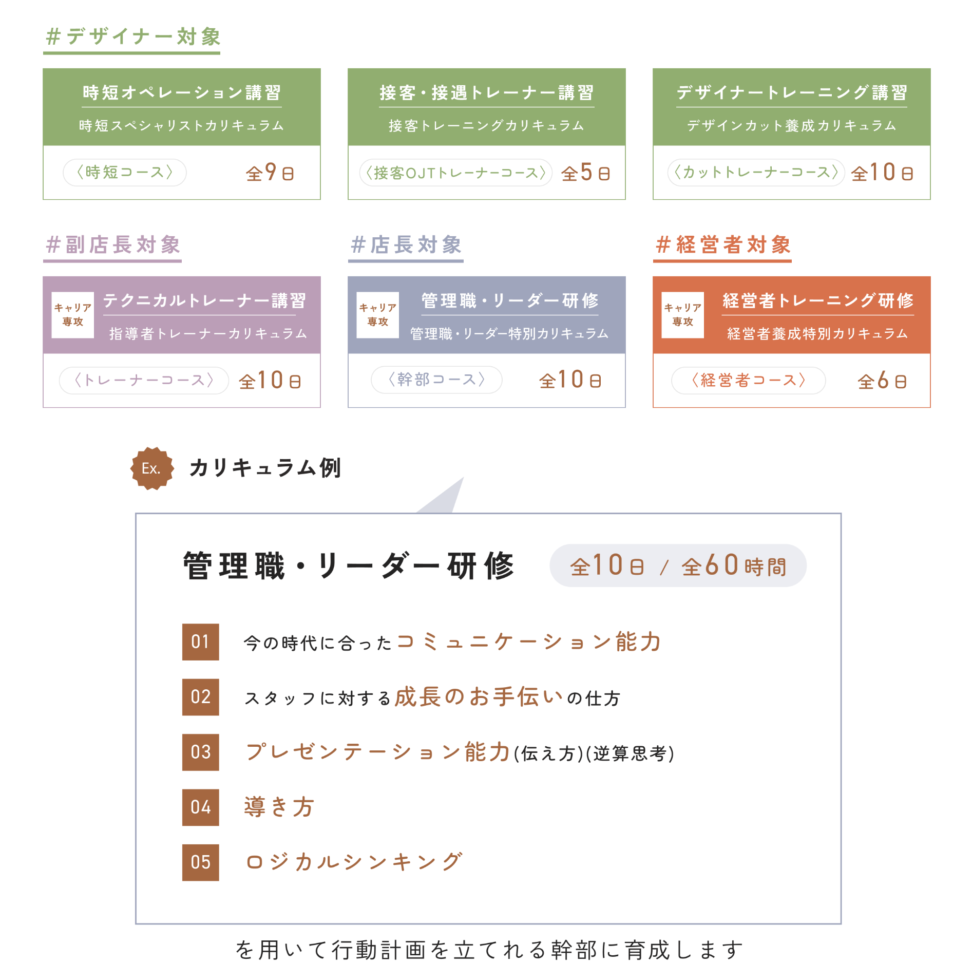 サロンマネジメントにおけるトレーナー、副店長、店長、経営者のキャリアスキルを向上するスペシャリスト養成のための研修プログラムです。